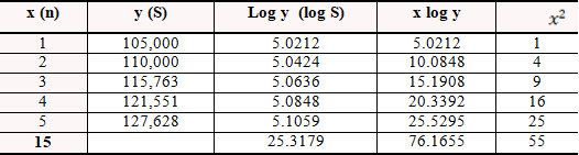 Table 5a shows the growth of an initial investment perceived by an investor with exponential growth bias. Compared to an unbiased exponential growth shown in Table 3, an investor with an exponential growth bias parameter, λ = 0.15 at an interest rate of 5% compounded annually, will perceive a lower growth in future value. For instance, without bias the future value at the end of year one is UGX 105,000 but an investor with exponential growth bias of λ = 0.15 will perceive a future value of only UGX 104,234 at the end of the first year. We shall regress exponential growth bias data in Table 5a on time as regressor. The detailed solution is given in Table 5b below: