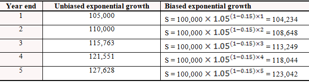 While the actual rate set by the fund manager (an insurance company) is 5% compounded annually, the rate earned per annum as perceived by an individual investor due to exponential growth bias of λ = 0.15 is only 4.23% per annum. As the value of the bias parameter increases, this perceived rate will continue to fall. This rate can easily be verified by looking at the percentage increase of initial deposit of UGX 100,000 to the perceived growth of UGX 104,234 at the end of year one. This biased perception may discourage saving and encourage current consumption instead. As discussed earlier, regression is very useful in this case because of its simplicity as compared to its counterpart, the non-linear exponential function. The decision maker in practice, with the aid of statistical software, would easily run these regressions using software and obtain useful results. Regression models can also be subjected to further statistical analysis like correlations, coefficients of determination, scatter plots etc to further permit more informed decision making.