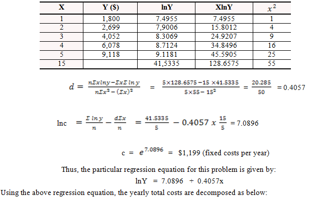 We shall estimate the slope parameter, d and the intercept, lnc. Table 7 generates key values for computation of linear regression equation for the non-linear exponential cost function. The resulting regression equation is used to decompose total costs into fixed and variable components. The fixed components are captured by the intercept of the regression equation and variable components are captured by the slope parameter of the regression equation.