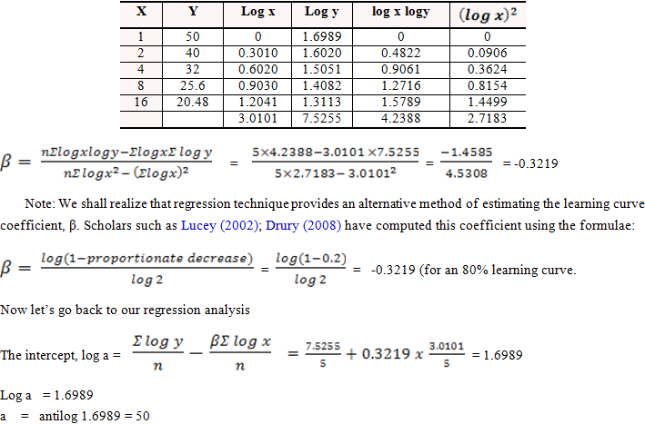 Table 11 shows the derivation of key values for computing regression equation based on data in Table 10. Unlike the previous cases, it is easy to note that in Table 11, both X and Y variables have been transformed to log variables. The slope parameter of the resulting regression equation in this case is used to determine the learning curve coefficient. However, it can also be used for forecasting purposes through the technique of linear interpolations. The workings demonstrate how to compute the learning curve coefficient using the technique of regression.