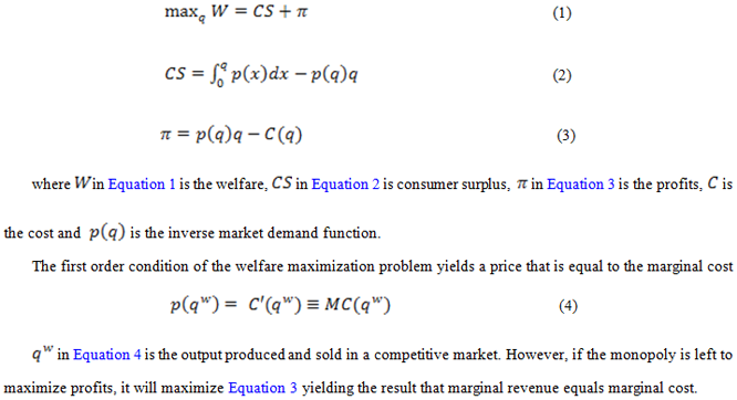 According to Berg and Tschirhart (1988) a welfare maximizing monopoly producing output q and charging price p faces a welfare and profit function of the following nature: