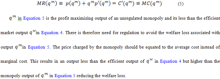 In electricity, transmission and distribution functions are identified as sectors that remains a natural monopoly (Jamasb & Pollitt, 2004; Laffont, 2005). This lack of a competitive market entails a welfare loss as the monopoly attempts to maximize profits (Gumus, 2007; Posner, 1999). However, requiring the monopoly to charge the competitive price would result in a deficit and make the firm financially insolvent. The society is better off if the firm is allowed to remain a natural monopoly and under appropriate regulatory policies such as provision of subsidies or average cost pricing (Berg & Tschirhart, 1988).