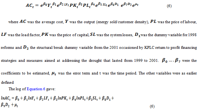 Following Dramani and Tewari (2014), average cost of transmission and distribution utility depends on energy sold, price of labour, load factor, price of capital and number of customers or customer density. To avoid multicollinearity problems associated with the average cost being a division of cost and energy sold, this article used energy sold relative to the customer density. Dramani and Tewari (2014) model was extended to include network losses and reforms. Network losses in Kenya are critical as KPLC is also a monopoly in retailing function, the inclusion of losses therefore helps capture inefficiency such as corruption, theft, metering, and billing errors. The reforms were included to assess the effect of regulation on the monopoly cost behaviour. Since Kenya has only one distribution company time series data was used for estimation. The general form of the average cost function at period twas assumed to take the form
