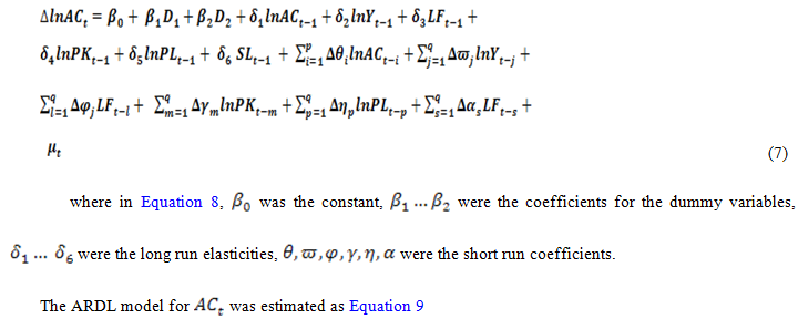 Following Pesaran, Shin, and Smith (2001), Equation 7 was estimated using ARDL bounds test procedure by modelling it as an error correction model specified as