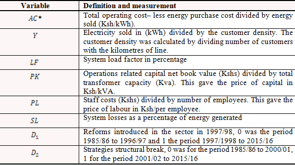 The article used annual data for 31 years for the period 1985/1986 to 2015/2016 sourced from KPLC annual reports. Table 1 provides a description and measurement of each of the variables used in the analysis. Price of capital and price of labour were adjusted for inflation using the electricity CPI index for Kenya base period February 2009 sourced from KNBS.