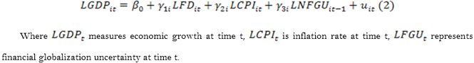 The current study uses annual data for the period 1980- 2019. The World Bank’s World Development Indicators (WDI, 2020) and International Monetary Fund (IMF) are the primary data sources. In this research, we used the real GDP as a measure of economic growth following Farouq, Sulong, Ahmad, Jakada, and Sambo (2020); Farouq et al. (2020); Jakada, Mahmood, Ahmad, Farouq, and Mustapha (2020); Dabachi et al. (2020); Ahmad et al. (2020). Domestic credit to private sector by Banks is the measure for financial development following Farouq et al. (2020); Ahmad, Ismail, Jakada, et al. (2020); Farouq et al. (2020); Jakada et al. (2020). Inflation is calculated as the annual percentage change in the consumer price index and it captures macroeconomic uncertainty following Farouq et al. (2020). While we proxy financial globalization uncertainty as the lagged one period of foreign direct investment inflows following Farouq and Sulong (2020): Farouq et al. (2020).