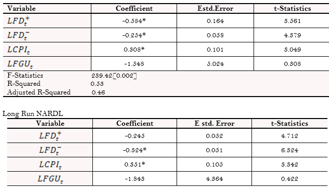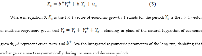 The NARDL approach is the asymmetrical development of a simple linear ARDL approach to check the degree of long-term interaction. Pesaran, Shin, and Smith (2001) established the approach and applied it to Shin, Yu, and Greenwood-Nimmo (2009) thus offering partial breakdown of nonlinearity. The method thereby models long-term interactions and dynamic ways of changing at the same time in a normal way. Applied to it, this approach entails the decomposition of the chosen element. Simply stated, the study breaks down the financial development into negative and positive sub-parameters. FD + and FD- represents partial positive and negative shifts. It can also be calculated as: