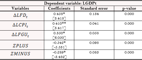 In this section, we present the result summary of the estimation as described in the Table 8 below, where the positive shocks of FD variable appear significantly and negatively affects the Nigerian productivity growth, and the corresponding negative shocks of the FD variable indicates also a negative and significant relationship. While, inflation turns out to be significantly positive in relation to the economic growth, whereas, the financial globalization uncertainty displays insignificant relationship.