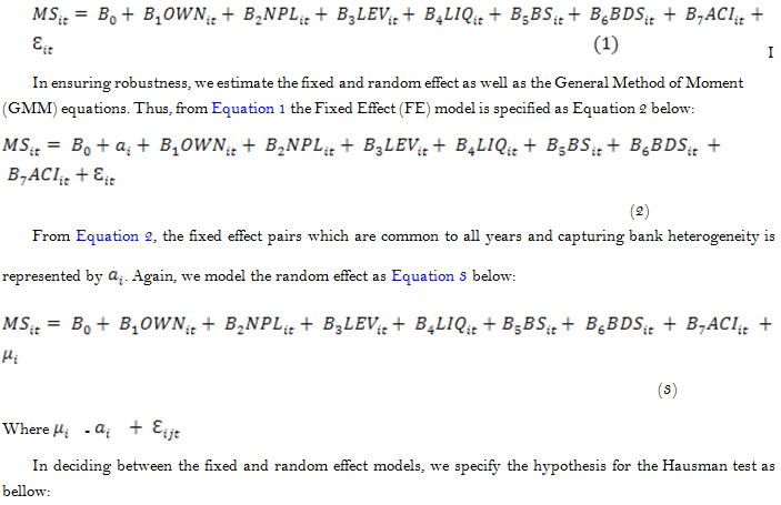 The Fixed and Random Effects (FE and RE) as well as the system General Methods of Moments (GMM) analysis were employed in examining the determinants of market share and its relationship with the profitability of banks in Ghana. Again, the dominance analysis is employed in determining the order of importance of the regressors. Based on the empirical review (Berger & Bouwman, 2013; Setiyono & Tarazi, 2014; Zopounidis & Kosmidou, 2008; Zouari & Taktak, 2014) and also theoretical literature found to be relevant to risk disclosure, variables such as Bank Ownership, Non-Performing Loans, Leverage, Liquidity, Bank Size, Board Size, and Audit Committee Independence were used in this study. The equation for this study on the determinants of market share of sampled banks in Ghana incorporating these variables is expressed in Equation 1 as: