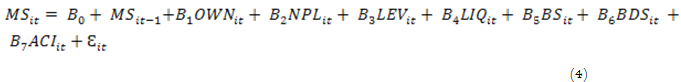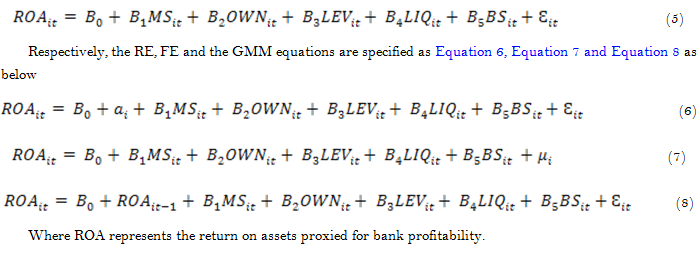 Also, to determine the effect of the market share on the profitability of banks, the study controlled for variables such as Bank Ownership, Leverage, Liquidity, and Bank Size (Berger & Bouwman, 2013; Setiyono & Tarazi, 2014). The equation for this relationship is expressed in Equation 5 as: