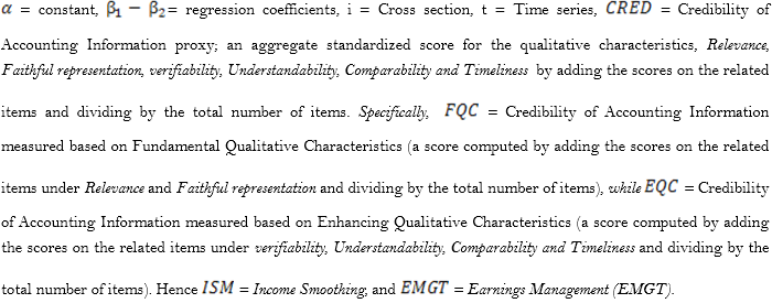Equation 2 represents the regression (predictive) model, estimating the effect of income smoothing and earnings management on credibility of accounting information.