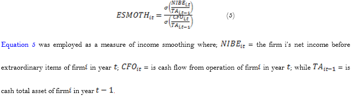 Prior literature had measured income smoothing and earnings management using the same parameter, the idea is that income smoothing is an attempt to reduce abnormality variations in income or earnings as the case may be, to the extent allowed under approved and sound accounting methods and principles, while earning management follow the same discretionary earnings pattern (Chen, Chen, & Su, 2001; Chen, Hope, Li, & Wang, 2011; Dechow & Schrand, 2004; Huang, Lyu, & Lin, 2018). Many others have used different measures for income smoothing and earnings management. Gaio and Raposo (2011) and Aguguom and Salawu (2018) had measured income smoothing using a different parameter as the firm-level standard deviation of income (earnings) NIBEit over the standard deviation of CFOit all lagged by TAit. Consequently, this study proposed to measure income smoothing using Equation 5:
