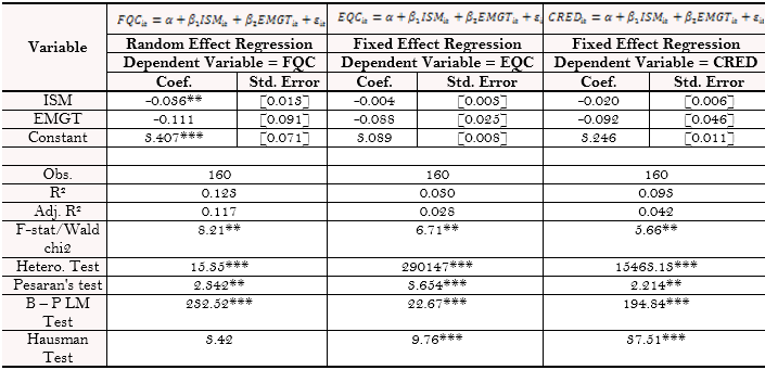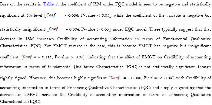 As per the fitness of the models, the results in the lower portion of the Table 2 depicts that the chosen regression estimator for this purpose has significant F-stat (P-value < 0.05) suggesting that the combined effect of the ISM and EMGT on the indicators of Credibility of accounting information is statistically significant at 5% level. Additionally, the Adjusted R-square is 0.042. Thus, the model is fit. Again, checking whether the classical assumptions of heteroscedasticity and cross-sectional dependence requirements are met; the significant results (P – values < 0.05) of Pesaran CD Test for cross sectional dependence and Breusch-Pagan test for heteroscedasticity suggest the rejection of the null hypothesis of no cross-sectional dependence and homoscedasticity in this model. Therefore, the regression models have cross sectional dependence and heteroscedasticity problem and for this reason Driscoll-Kraay standard errors are used.