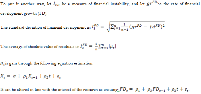 The author creates a financial instability index based on Loayza and Ranciere (2006). These two methods to calculating financial instability have two advantages: the first is the standard deviation growth rate of the concerned measure. The absolute value of residuals obtained by regressing financial development on its lagged value with time pattern is the second and final strength.