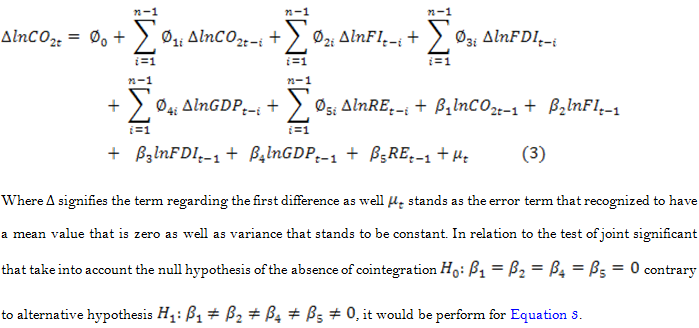 Ever since their works were developed by Pesaran, Shin, and Smith (1999) as well as Pesaran, Shin, and Smith (2001), the ARDL bound test approach to cointegration has become one of the most widely used methods of analysis. This is because, compared to other similar co-integration approaches such as Johansen and Juselius (1990) as well as Engle and Granger (1987) the methods have a range of advantages. Under this approach, there is no need to have a number of variables with the same integration order or to have the variables with similar optimal system lags, no need to have a large or non-existence sample of endogeneity among the regressors to obtain an efficient estimator. Similarly, since a reduction-form of an equation that is single will give the same results, the techniques do not require an equation that is multiple (Farouq, Sulong, Ahmad, Jakada, & Sambo, 2020). Essentially, the Bound Test ARDL approach to cointegration involves two long-term relationship estimation steps. The first step is to explore the existence of a long-term relation between variables in the Equation 2. The model of ARDL will, therefore, be given as Equation 3:Pesaran et al. (2001) provided two sets of important values for the F-statistics: the lower bound corresponds to the case where I(0) is all variables, and the upper bound corresponds to the case where all the variables are I(1). If the F-statistic resides below the lower bound, there can be no co-integration. If the F-statistic is above the upper limit, then a co-integration can take place. Therefore, the test is inconclusive if the F-statistics are between the upper and lower limits. The second stage consists of performing the general error correction representation of the selected ARDL model of Equation 4 Listed below: