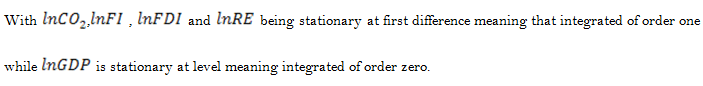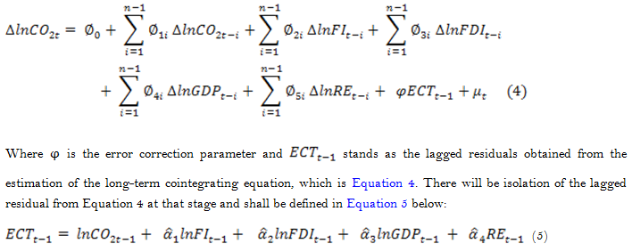 With regard to the nexus of FDI inflow and CO2 emissions, the result provides clear evidence that, in the long run, FDI has substantial negative relations with CO2 emissions. The coefficient of the FDI inflow in the long run is -0.154 respectively.