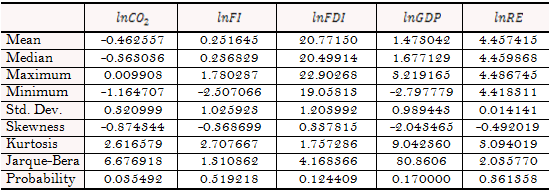 The study's empirical findings are summarised and discussed in this section. In Table 2 below, the analysis first presents the descriptive statistics of the variables described. The outcomes of the probability values and the Jarque-Bera demonstrate that the variables are normally distributed. Kurtosis and Skewness do not contain extreme values in the distribution. Similarly, in Table 2, the correlation matrix results reveal the degree of interaction between the variables.