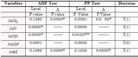 The goal of this study is to examine the relationship between financial instability and Nigeria's state of environmental quality. We use Augmented Dickey-Fuller (ADF), and Phillips Perron (PP) unit root tests simultaneously to determine the order of integration of the variables and assess whether the possibility of using ARDL is viable or not. Furthermore, the unit root test is an important prerequisite for testing the order of integration since it confirms that regression analysis findings are not spurious.