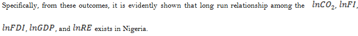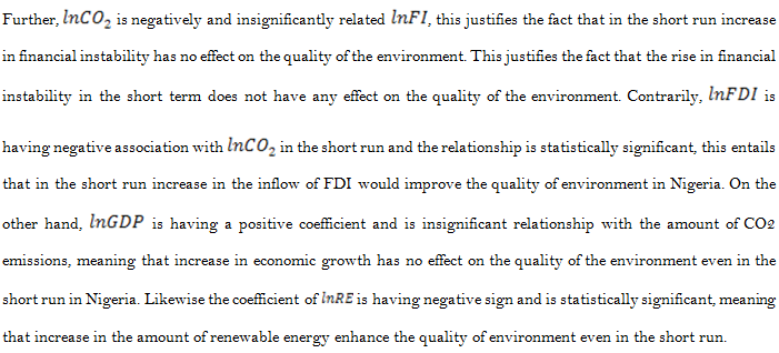Turning to the long-term relationships, as shown in Table 6 respectively. Some interesting details concerning the nexus of financial instability and CO2 emissions in Nigeria are provided in the empirical findings. The long run relationship between financial instability and CO2 emissions is positive and significant and the coefficient of financial instability is 0.740, meaning that a 1% increase in the financial instability will leads to a 0.74% increase in the amount of CO2 emissions respectively. This means that financial instability is a major contributor to CO2 emissions, thus worsening the quality of Nigeria's environment.