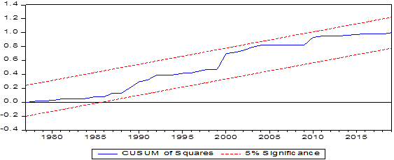 However, CUSUM (Cumulative Sum of Recursive Residuals) and CUSUMQ (Cumulative Sum of Square of Recursive Residuals) (Cumulative Sum of Square of Recursive Residuals) have been used for stability testing in order to ensure the robustness and stability of the model parameters. In the two test graphs shown in Figures 1a and 1b below, with regard to the stability of the parameters, the decision rule was based on the position of the CUSUM and CUSUMQ graphs. As provided, the stability tests of both CUSUM and CUSUMQ are considered stable and consistent since the models fall within the critical limits at the significance level of 5 percent.