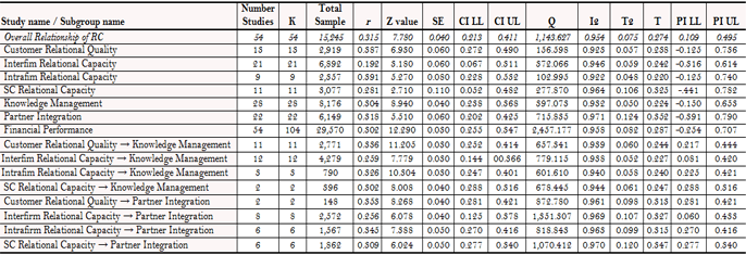 The meta-analytic procedures robustly answer the research questions first trough the random effect of Hunter-Schmidt type meta-analysis (HSMA) to calculate and compare the mean effect sizes for the variables presented combinations (see Table 1). Second, through meta-analytic structural equation modeling (MASEM) we examine direct and indirect effects of RC dimensions on firm financial performance and conduct mediation tests. And third, using the meta-analytic regression analysis (MARA) we test the moderating effects of Knowledge management and partner integration. We follow Bergh et al.(2016) to establish the guidelines for performing these analyses. Further details procedures are ahead(Bergh et al., 2016).