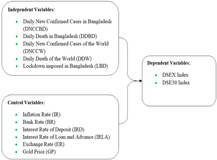 For measuring the effect of different Covid-19 variables are used as Daily New Confirmed Cases in Bangladesh (DNCCBD), Daily Death in Bangladesh (DDBD), Daily New Confirmed Cases of the World (DNCCW), Daily Death of the World (DDW), and Lockdown imposed in Bangladesh (LBD). Here lockdown is used as the dummy variable where no lockdown set in the country equal to zero and lockdown imposed in the government equal to one used. In addition, Inflation Rate (IR), Bank Rate (BR), Interest Rate of Deposit (IRD), Interest Rate of Loan and Advance (IRLA), Exchange Rate (ER), and Gold Price (GP) are used as the control variables.