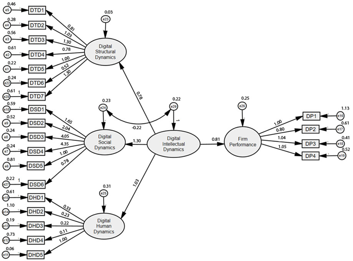 Each of the three DID dimensions, and their intertwining with dynamic capabilities, has been individually studied in the literature on intellectual capital. However, DID for managing all levels of performance is complex, structured, and multidimensional (Bontis et al., 2015; Buenechea-Elberdin et al., 2017; Du et al., 2021; Sardo et al., 2018; Wang et al., 2019), therefore it is defined as a second-order variable according to the multidimensional construct structure rules discussed in Wong, Law, and Huang (2008). It measures three first-order formative variables: Digital Human Dynamics, Digital Social Dynamics, and Digital Structure Dynamics. These DID first-order variables describe different facets of the construct and are therefore also formative rather than reflective constructs because there is no high degree of correlation among the subdimensions. Furthermore, the removal of any of the subdimensions would alter the conceptual meaning of DID.