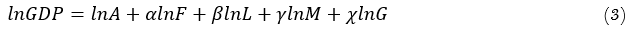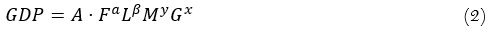 Equation 2 is the modified function in which variables are added, including labour (L), capital invested in fixed asset (F), total length of metro (M), and government expense (G).