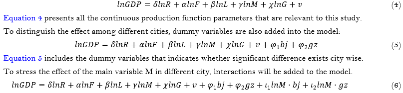 Due to the similarity in scale of Shanghai, Beijing and Guangzhou. The scale adjustment will not be done by this stage, but this also means that Hong Kong will have to be eliminated due to a mismatch of GDP per capita and some other factors. Analysis that includes Hong Kong will be introduced later. Also, given the available data, there is a lack of the index to indicate the technology factor of a city. As a result, we assume that the production technology of urban firms can be approximated by a variable that is closely related to the technology state of the city, that is yearly research and development expense (R). This replacement resembles to a proxy variable. To redeem this effect, certain error term must be added to the model to prevent a potential diminishing of the unbiasedness. The estimating equation for the modified Cobb-Douglas function is: