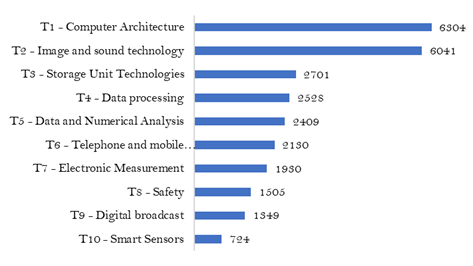 The top ten HAI technologies Figure 4 are computer architecture (12.9%) and Image and sound technology (12.4%). In sequence, Storage Unit Technologies (5.5%) and data processing (5.2%), followed by Data and Numerical Analysis (4.9%), Telephone and mobile communications (4.4%), Electronic Measurement (3.9%), Safety (3.1%), Digital broadcast (2.8%) and Smart Sensors (1.5%).