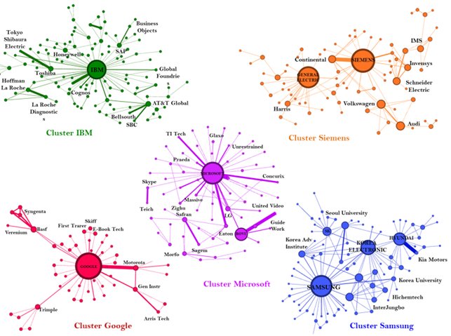 In addition, in cooperation networks, STIs and governments’ role are not preponderant or found as central nodes or intermediaries of cooperative relationships, except to Samsung's cooperation network where the presence of universities is highly evidenced corroborating with (Fischer, Schaeffer, & Vonortas, 2019) who mention that multinational corporations deeper connections with domestic and foreign agents are needed to accelerate universities' contribution for technology upgrading.