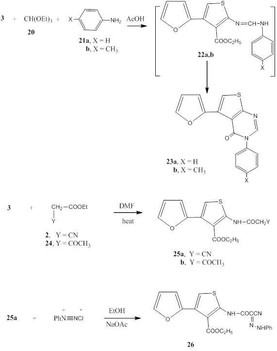 Next we moved towards studying the reactivity of compound 3 towards the reaction with ethyl orthoformate followed by condensation reactions. Thus, compound 3 reacted with ethyl orthoformate (20) and either aniline (21a) or p-toluidine (21b) in acetic acid solution to give the thieno[2,3-d]pyridine derivatives 23a and 23b, respectively. The reaction took place through the intermediate formation of the 2-alkylatedaminothiophene derivative 22a, b. The structure of compounds 23a and 23b was based on the analytical and spectral data. The reaction of compound 3 with either ethyl cyanoacetate (2) or ethyl acetoacetate (24) gave the 2-amido derivatives 25a and 25b, respectively. The analytical and spectral data of compounds 25a, b was consistent with their respective structures (see experimental section). Compound 25a reacted with benzenediazonium chloride in ethanolic sodium hydroxide solution to give the phenylhydrazo derivative 26 (Scheme 4).