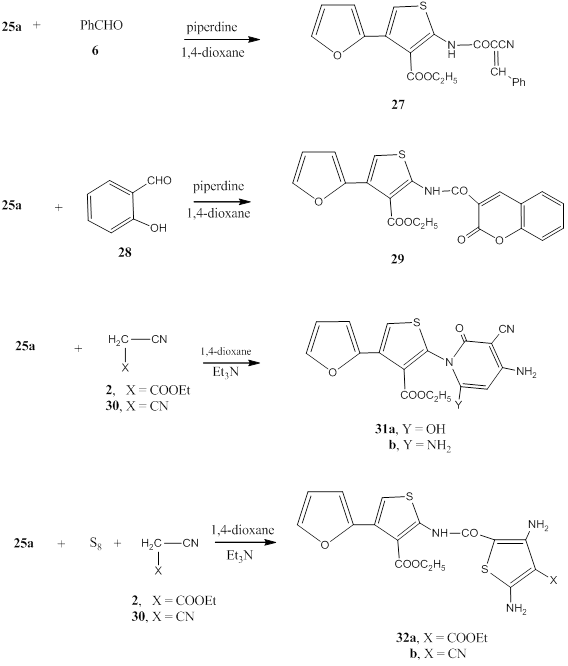 Our research program was directed towards the uses of compound 25a towards the synthesis of pyridine derivatives with potential biological activities [15]. Thus, the reaction of compound 25a with either ethyl cyanoacetate (2) or malononitrile (30) gave the pyridine derivatives 31a and 31b, respectively. Compound 25a reacted with elemental sulfur and either of ethyl cyanoacetate (2) or malononitrile (30) to give the thiophene derivatives 32a and 32b, respectively (scheme 5). The analytical and spectral data of the latter products are in agreement with their respective structures. Thus, the 1H-NMR spectrum of compound 32a (as an example) showed The presence of two triplets at δ 1.12, 1.14 ppm equivalent to the two ester CH3 groups, two quartets at δ 4.21, 4.26 ppm for the two ester CH2 groups, two singlets (D2O exchangeable) at δ 4.41, 4.59 ppm indicating the two NH2 groups, a singlet at δ 6.04 ppm equivalent to the thiophene H-5 proton, a multiplet at δ7.23-7.39 ppm for the furan protons and a singlet (D2O exchangeable) at δ 8.23 ppm for the NH group.The work described here concerned with the synthesis of thiophene derivatives starting from 2-acetylfuran followed by studying of the chemical transformations through the thiophene ring system. The screening of the resulting compounds towards three cancer cell lines showed that compound 13b gave the maximum inhibitory effect among the synthesized products.