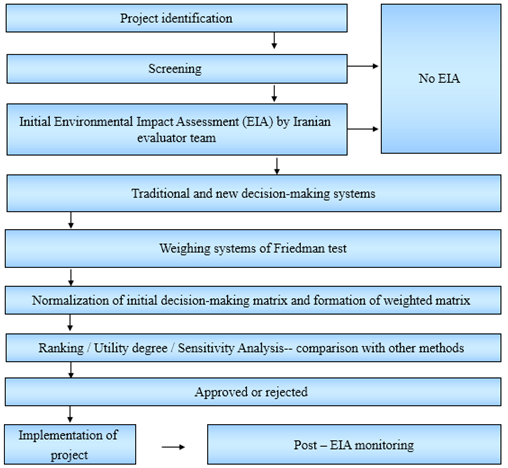This study contributes in the existing literature to Environmental Impact Assessment (EIA) of industrial projects conducted by the Iranian evaluator team. The screening of ICI scrutinized the existing properties of projects as a first report. The methodology employed traditionally to new decision-making models towards sustainable development of projects.
