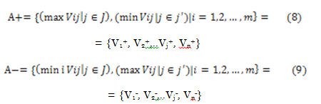In the next step to figure out the ideal positive solution (A+) and the ideal negative solution (A-) were employed the Equations of 8 and 9. To carry out the values were highlighted the selected values at each column of the matrix. The best values for positive indicators were assumed as the largest values (Vij), and for negative indicators, the smallest values. The worst values for the positive indicators are the smallest values, and for the negative indicators, are the largest values.