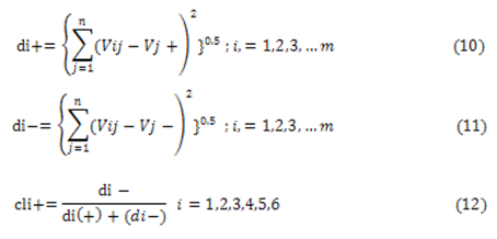 To find out the distance between each option from the positive and negative ideal solutions was used the Euclidean distance. By the way, the distance was estimated based on both positive ideal options (dj+) and the negative ideal options (dj-) according to Equations 10 and 11 and the following formula of 12 was applied to determine the relative approach to the ideal solution. The higher the cli+, the higher the weighting value will be released [27].