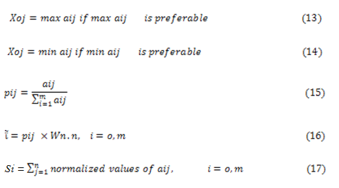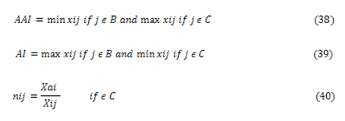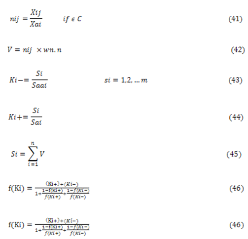 This method also needs to set up a matrix of data (1) initially. The procedure posed to compute the ranks values undergo some steps such as (2) distinguish ideal (AI) and anti-ideal (AAI) solutions (3) according to Equations 38 to 39. B offers a benefit group of criteria, while C offers a non-benefit group of criteria. (4) Normalization process using Equations 40 to 41. Xij and Xai include the elements of the matrix. (5) Assign the values of weight into the matrix according to Equation 42. (6) Utility degree (division between the sum of Normalized and Weighted (NW) values in the matrix of data to the sum of maximum NW values in the matrix) identification using Equations 43 to 45. (7) Determination of the utility function of alternatives f (Ki) associated with AI and AAI, Equations 46 to 48.