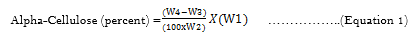 A three-gramme oven-dried sample was used placed in a 250ml Erlenmeyer flask with a small watch glass cover. The flasks were placed into water bath that was maintained at 20 °C. The sample was treated with 50 ml of 17.5 percent NaOH and thoroughly mixed for one minute. After the specimen is allowed to react with the solution for 29 minutes, 50ml of distilled water was added and mixed well for another minute [10].