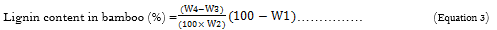A two-gramme sample of oven-dried extractive-free bamboo was weighed and placed into a 250 ml flask with a small watch glass cover. The crucibles were then oven-dried at 103 ± 2°C, then cool in a desiccator, and weigh until a constant weight was reached [11].