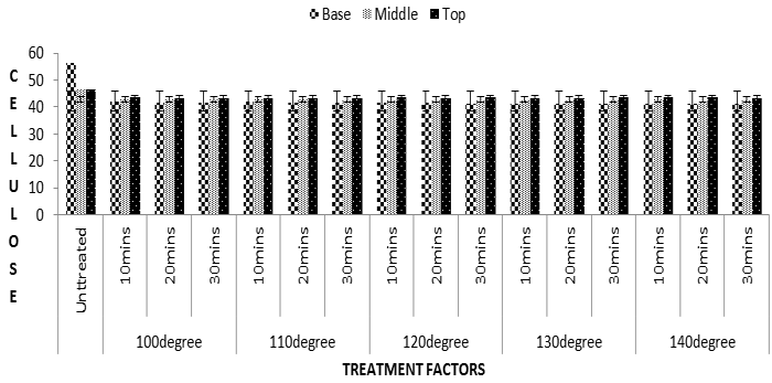 The variation in mean value of percentage cellulose content of the thermal-modified Bambusa vulgaris is presented in Figure 1. At the base, it ranged from 41.79 to 41.02%, the mean percentage value for middle samples ranged from 42.73 to 42.21% while for the top samples ranged from 43.49 to 43.41%. The heat treatment impacted the cellulose content of Bambusa vulgaris slightly because of the mild temperature variation (°C) adopted. There was a percentage decrease in the cellulose content of bamboo culm from the top to the base, notwithstanding there was a slight decrease in the mean value of cellulose content from 100 to 140 °C also the treatment time (minutes) affected the cellulose content. There is an increasing trend in the percentage of cellulose content value from base to top, the untreated bamboo top samples had the highest percentage cellulose content (46.56%) as shown in Figure 1. This view was reported by Bremer, et al. [14] on the chemical composition of thermal-modified two Vietnamese bamboo species; namely Dendrocalamus barbatus, Dendrocalamus asper, at temperature variation(°C) 130, 160 and 180°C with respective treatment time(minutes); 2 hours and 5 hours, Their percentages cellulose content ranged from 50.7 to 46.13% for Dendrocalamus barbatus, ranged from 49.41 to 47.01% for Dendrocalamus asper, the modified samples showed a continuous decrease during modification in respect to increase in temperature and time variation, but only a maximum loss of 5% of cellulose was observed for both species. Cellulose is fairly impacted by thermal treatment compared with the other chemical constituents in bamboo this is in agreement with the studies of Xiaomeng, et al. [1], Comparing thermal treated with untreated samples, it was observed that the contents of cellulose and hemicellulose in treated bamboo decrease. With the increase of heat treatment temperature, the contents of cellulose and hemicellulose decrease gradually. The reason for decrease of cellulose content is specifically due to the volatilization of small molecular degradation products during the process of oil-heat treatment [15]. Cellulose as the main component exhibited a higher thermal stability than hemicellulose because of its crystallinity, this could be attributed to a shortening of cellulose chains. The follow up test further revealed the interaction effect between temperature variation and time Table 1.