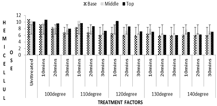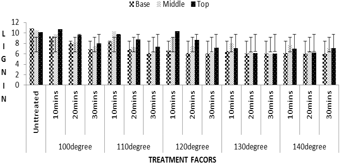 The values obtained for lignin content are illustrated in Figure 4. Lignin content varied consistently in decreasing order from base to top. However, the trend is in reverse in the temperature variation (°C), the percentage lignin contents increased with an increase in the temperature of variation and treatment time from 100-10minutes to 140°C-30minutes. This gain in the Lignin percentage content is as a result of hydroxyl linkage of lignin.
