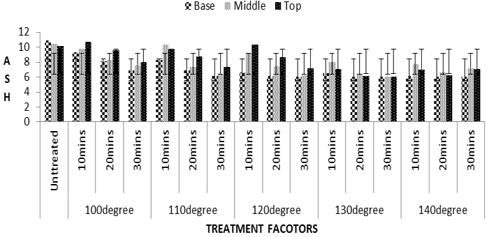 There was a significant difference at 5% level of probability in sampling height, temperature variation (°C) and time duration, The average mean variation value Ash content percentage of the thermal-modified bamboo is presented in the Figure 5. The mean value ranged from 0.70 to 0.50% at base samples, also, the mean ranged from 0.75 to 0.66% at middle while from 0.86 to 0.75% at the top samples with treatment temperature and time; 100, 110,120,130 and 140°C and 10, 20 and 30 minutes. The highest ash percentage content is recorded at the untreated top samples (0.95%) while the least value (0.55%) is found at the highest temperature and time level 140 °C-30minutes. The percentage ash content was highest at the untreated top samples; the thermal modification imparted the percentage ash content with a decreasing trend from top to base. Bambusa vulgaris ash content is quite high compared with some other species of bamboo, if silica is found in sufficient amounts (0.5% oven-dry1 weight), it can dull machining equipment [19]. The ash content of wood is made up of inorganic minerals, primarily calcium, potassium, and magnesium. Manganese and silica are two other common minerals. The follow up test further revealed the interaction effect between temperature variation and time Table 1.