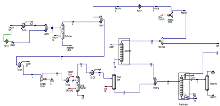 Unit operations used in the simulation were conversion reactor, equilibrium reactor, condenser, absorber, mixers, separators, heaters, recycle, tee, cooler, and compressor. The Peng-Robinson thermodynamic model was selected in simulating the synthesis gas production loop while the Extended Non-Random Two-Liquid (Extended NRTL) was used from the DME synthesis loop to the end of the process due to the nonpolar components introduced after the synthesis gas production.