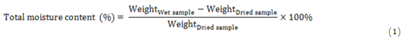 The hypertonic solutions of 20, 40 and 60 °Brix were prepared by dissolving 20, 40 and 60 g of sucrose respectively in 100 g of distilled water. The sucrose and water was evenly mixed with a glass rod to ensure the sucrose is completely dissolved in water. After that, 15 g of orange peels were weighted and immersed in the hypertonic solution of different concentrations (20, 40 and 60 °Brix) for an hour. The sample was then removed from the solution and dried in an oven (AE-18N, Pensonic, Malaysia) at 100 °C. The weight of the sample was measured by using a weighing balance at every 5 min until a constant weight was obtained. The total moisture content percentage of the sample was calculated by using Equation 1 [17]. The dried sample were grinded into powder form by using the grinding machine (RW-5082, Richwell, Malaysia) and stored in an air tight container for further use in the adsorption process.
