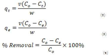 The adsorption capacity at time t, qt (mg/g) and equilibrium adsorption capacity, qe (mg/g) were calculated by using Equation 2 and Equation 3 respectively. These values were further used to determine the isotherms of kinetics of the adsorption. The total percentage removal of dye by the absorbent was calculated by using Equation 4.