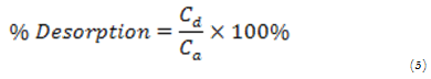 The samples of untreated orange peel, orange peel treated with osmotic dehydration at optimum concentration, and orange peel treated with ultrasound-assisted optimum osmotic dehydration were used for desorption experiment. Each sample with dosage of 150 mg were added into a 100 mL dye solution with concentration of 20 mg/L in a 250 mL beaker and agitated for 700 rpm. After adsorption, the adsorbent was removed from the dye solution through centrifuge machine (2-6E, Sigma Laborzentrifugen, Germany) at 3000 rpm for 12 min. The absorbent was added into a 250 mL beaker containing 100 mL of 1 M NaCl and agitated at 700 rpm for 160 minutes. The concentration of the dye was measured every 10 min by using the UV spectrometer. The percentage of desorption was calculated using Equation 5 and compared with the adsorption percentage.