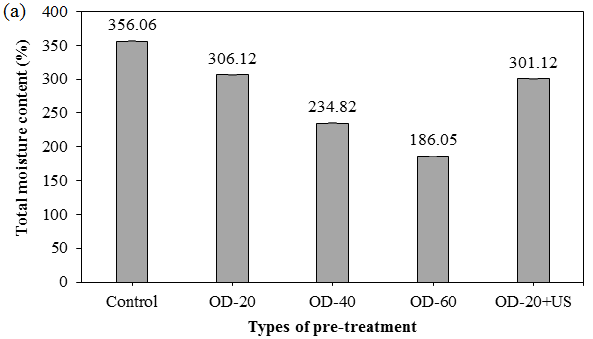Moisture content in the orange peel is very important to be removed for its adsorbent preparation. Osmotic dehydration and ultrasound pre-treatment will eventually affect the drying time of a sample [19]. The researcher proved that both pre-treatments will increase the diffusivity of water from the sample during the air drying process. The osmotic pre-treated sample will result in water loss and sugar gain due to diffusivity of sugar particle in the hypertonic solution [19]. Furthermore, ultrasound treatment which creates the microscopic channel allowed the diffusion of water to be much easier [16]. Figure 1(a) shows the total moisture content percentage of sample treated with osmotic dehydration at different concentration of hypertonic solution, i.e. 20 °Brix (OD-20), 40 °Brix (OD-40) and 60 °Brix (OD-60). The results were compared with the sample without treatment and sample treated with ultrasound-assisted osmotic dehydration at 20 °Brix at 90% sonication power (OD-20+US).