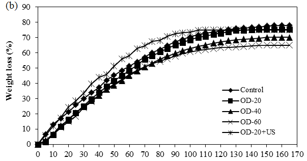 Figure-1. Percentage of (a) total moisture content and (b) weight loss of orange peel after osmotic dehydration (OD) and ultrasound (US) pre-treatments.
