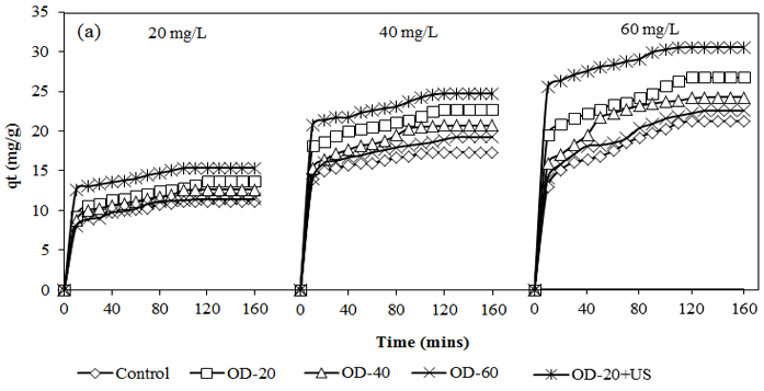 In the OD treatment without ultrasound for the adsorption of 40 mg/L dye solution, OD-20 has the highest equilibrium adsorption capacity, followed by OD-40 and OD-60 as showed in Figure 2(a). This might due to lower sugar component remained in the cell structure causing higher amount of pores available to trap the dye ions. The result further shows that when OD-20 was assisted with ultrasound treatment, its adsorption capacity was 8.06% higher than the OD-20 sample without ultrasound treatment. It is suggested that the porous structure and microscopic channel which created by ultrasound cavitation effect on the sample have contributed as the adsorption sites to bind with the dye ions [20, 21]. The adsorption capacity of all the adsorbents with different pre-treatment show a similar trend at all the dye concentrations from 20 mg/L to 60 mg/L. As the concentration increased, the adsorption capacity will also increase.