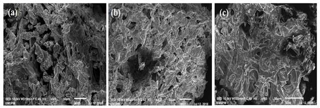 Figure-5. Image of scanning electron microscopy for (a) untreated adsorbent, (b) OD-20 and (c) OD-20+US pre-treated adsorbents